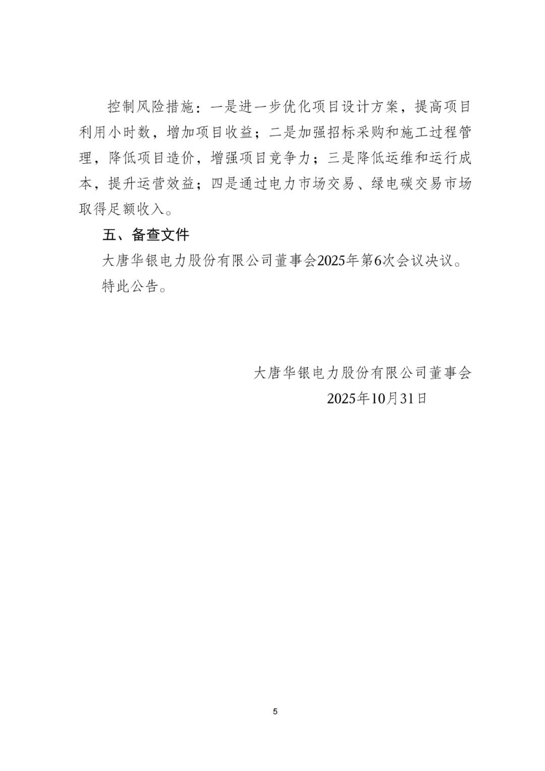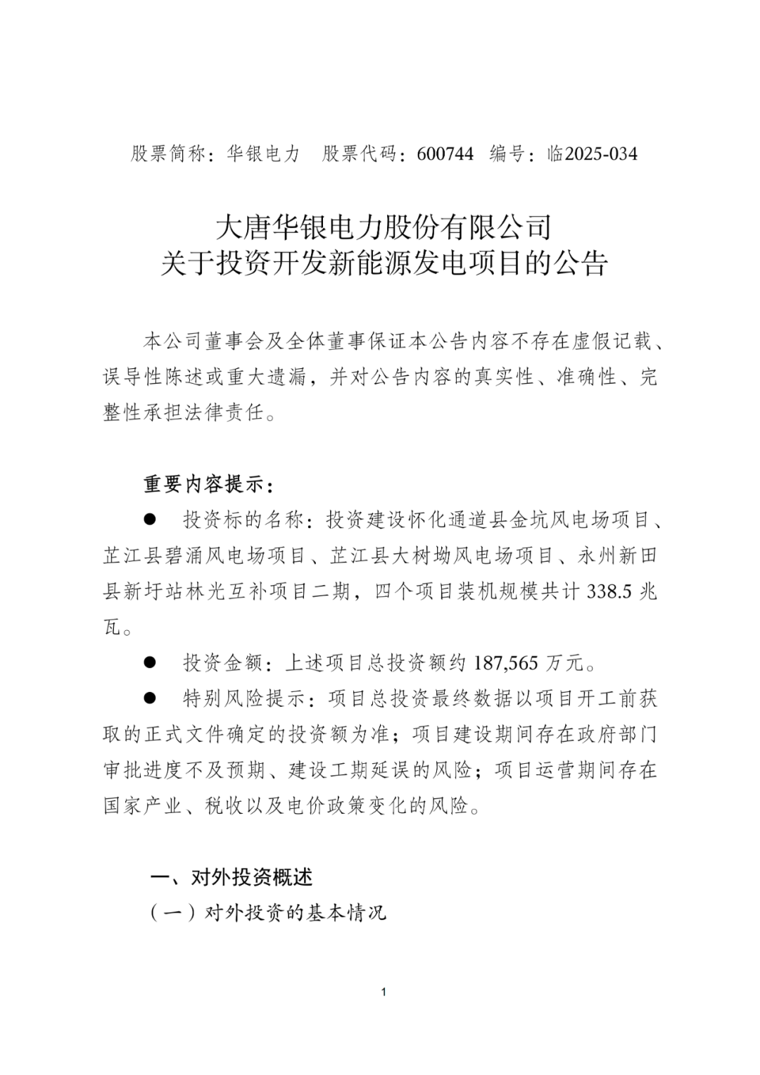 10月31日,大唐华银电力股份有限公司发布《关于投资开发新能源发电项目的公告》,拟投资18.7565亿元建设338.5MW风、光项目。