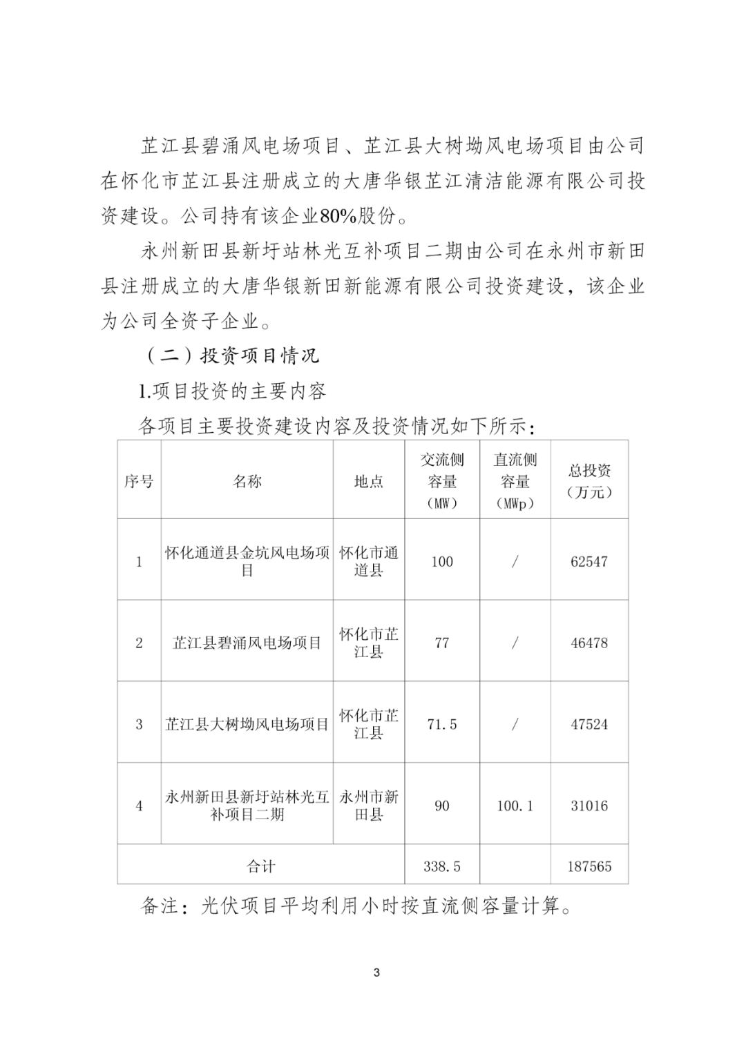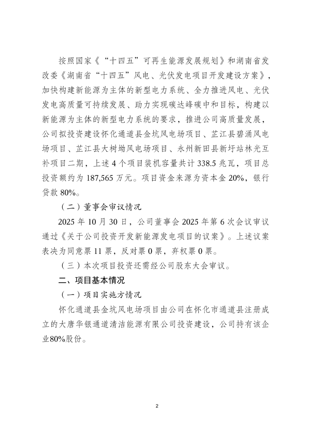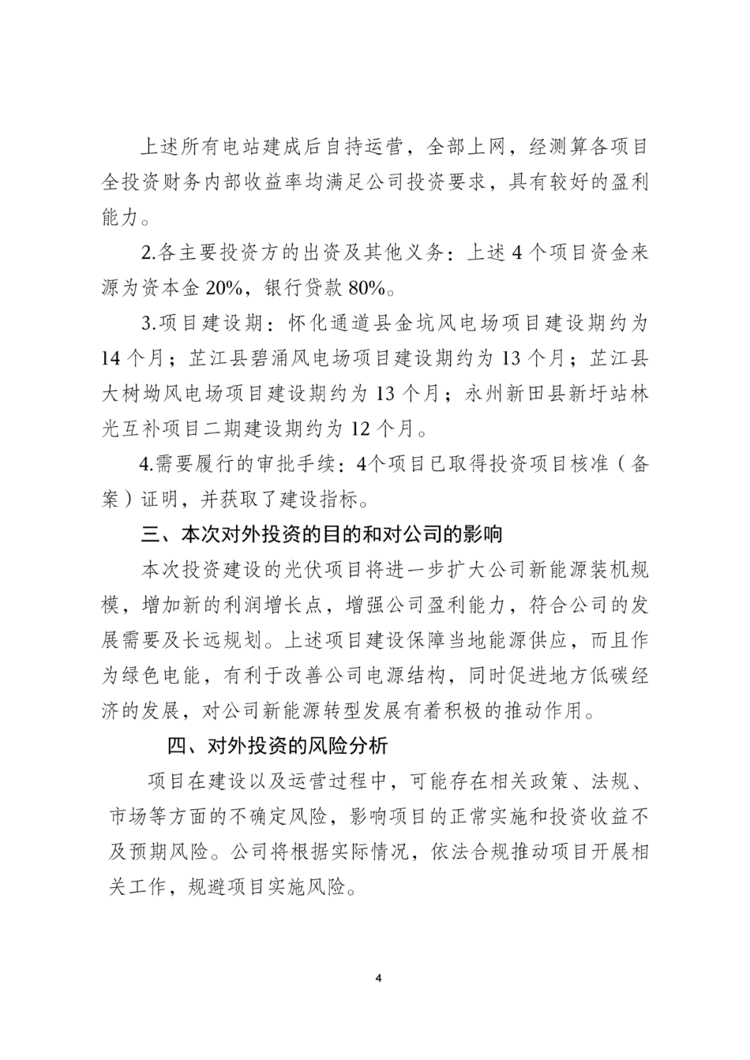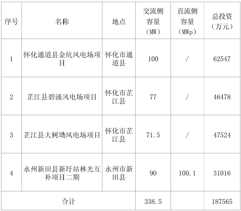 根据公告,本次投资的四个项目包括三个风电项目和一个光伏项目,包括怀化通道县金坑风电场项目、芷江县碧涌风电场项目、芷江县大树坳风电场项目、永州新田县新圩站林光互补项目二期。上述4个项目资金来源为资本金20%,银行贷款80%。